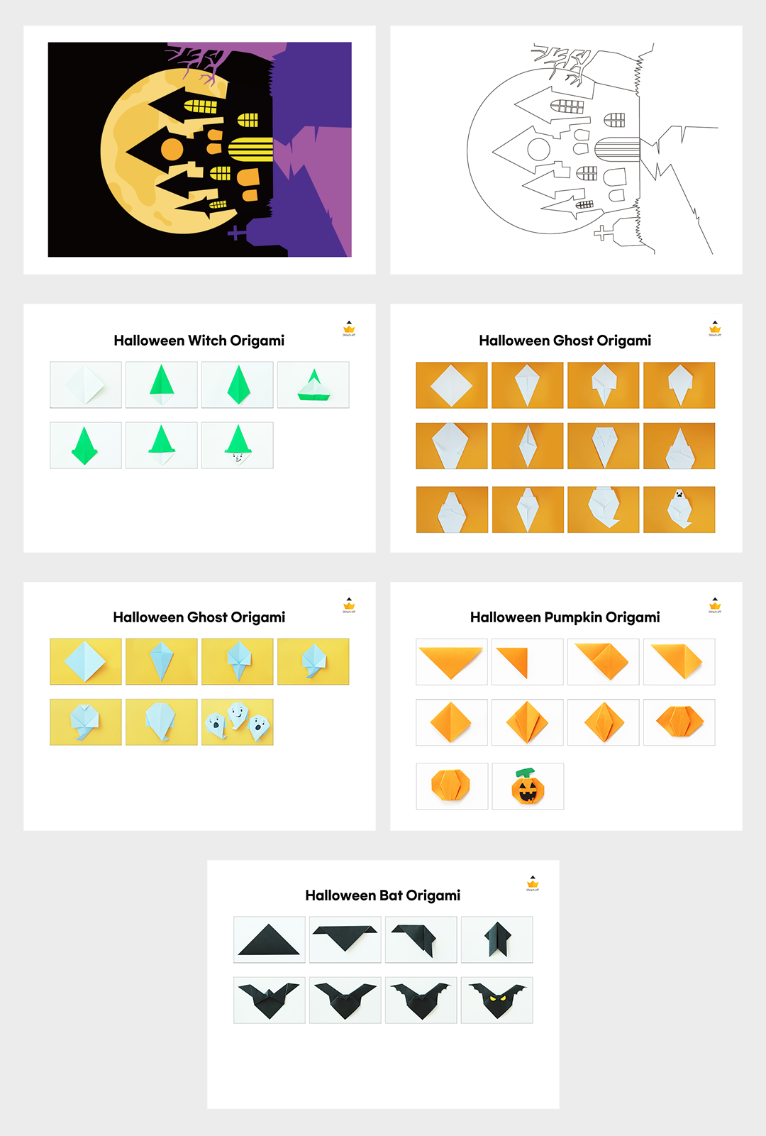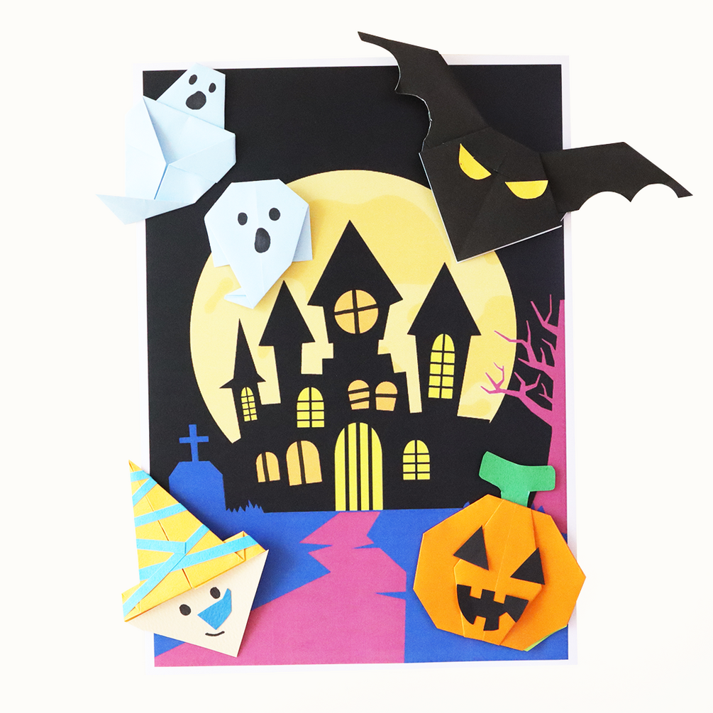 Once you’ve made these Halloween characters, you can draw a mysterious and spooky castle in the background. When you attach your origami creations to it, you’ll have an amazing piece of art to show off! Get ready for a thrilling and creative adventure!