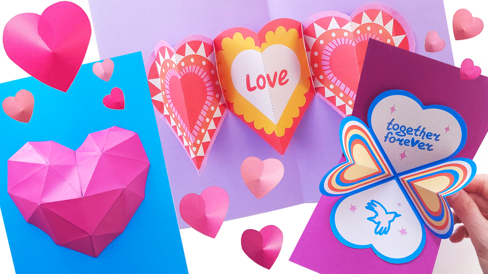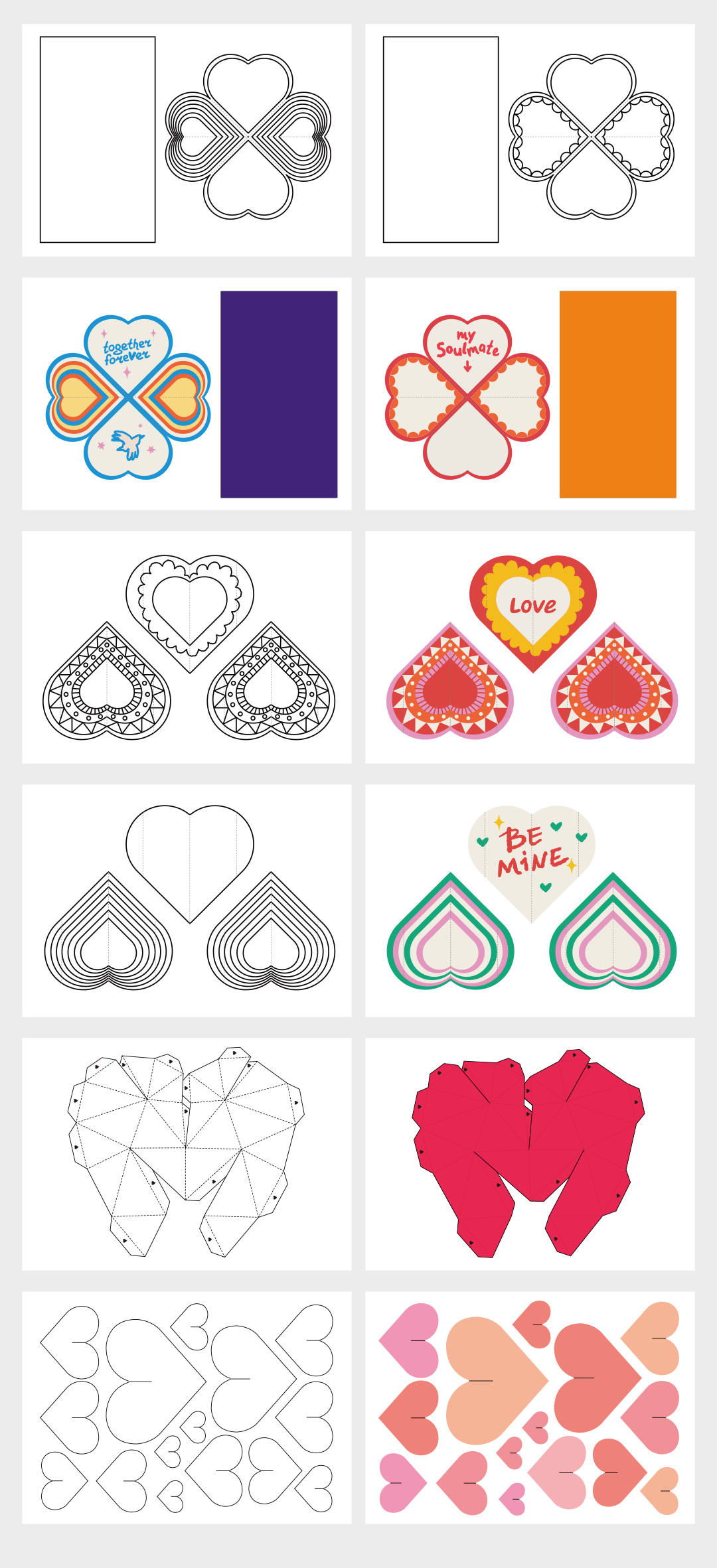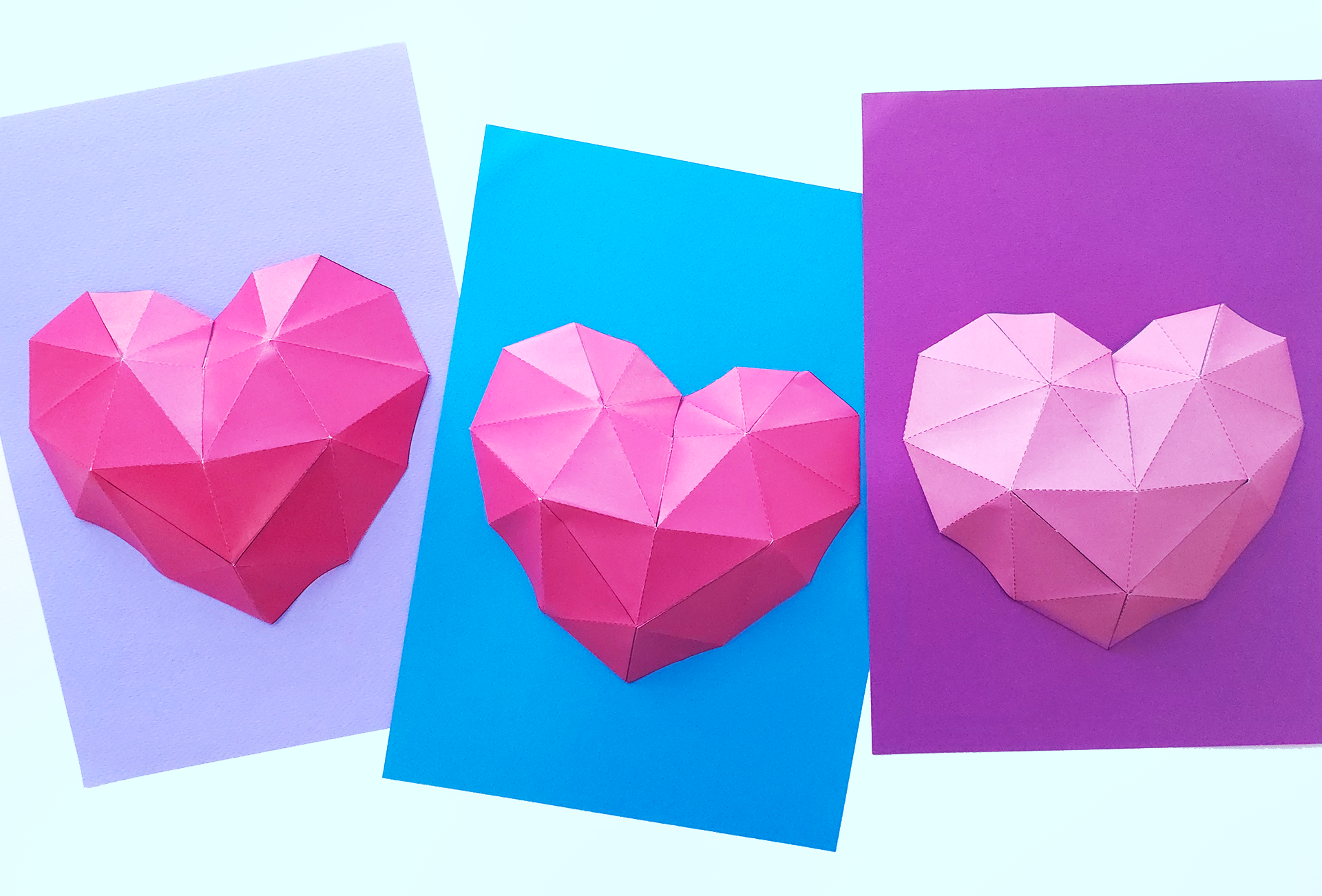 Children can color, cut, fold, and assemble their own cards and heart sculptures, making this a fun and meaningful paper craft activity for kids.