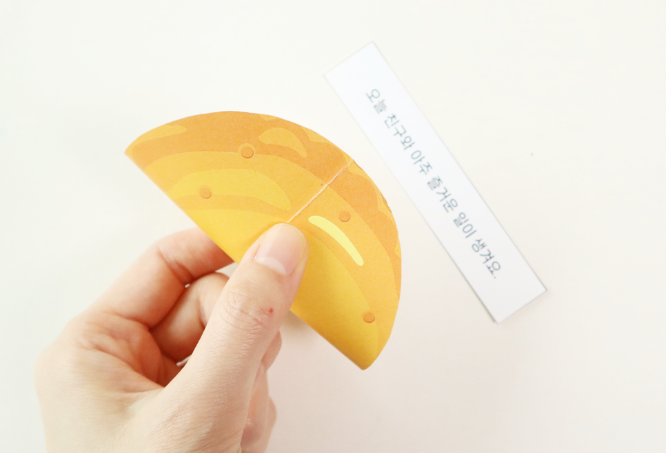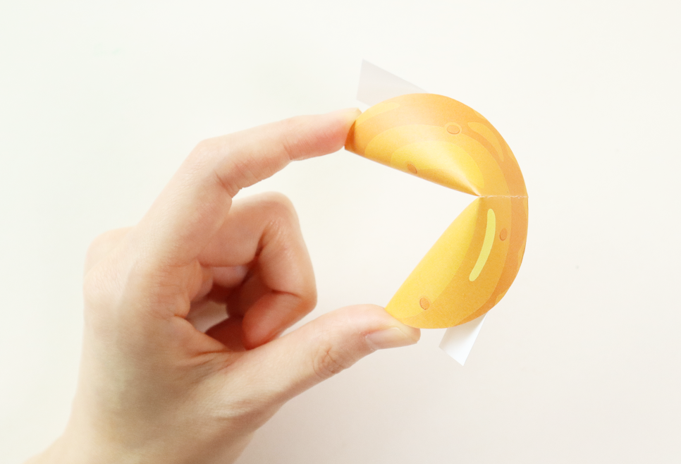 Simply cut out the cookie-shaped circles, write a message on the small paper strip, place it inside, and follow the folding steps to complete your paper fortune cookie.