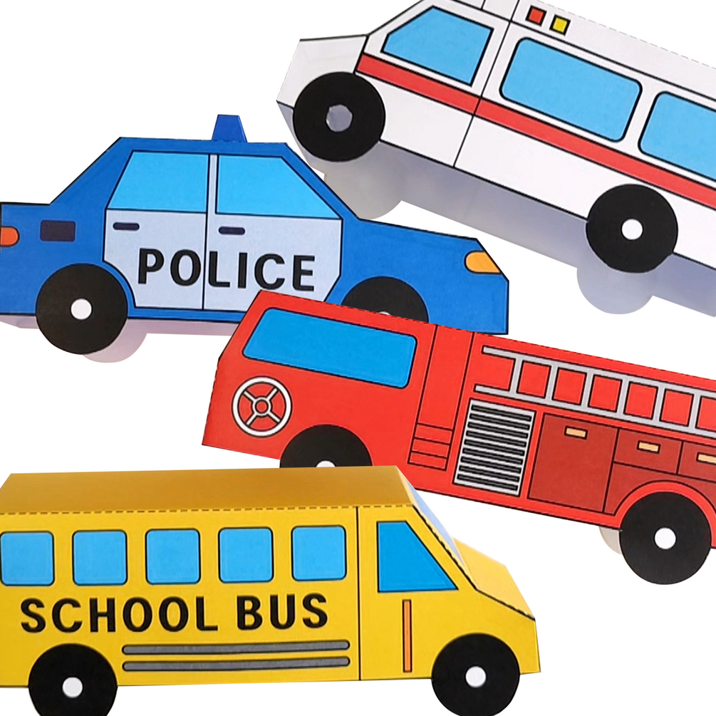 🚗 We've prepared 3D car templates that children can color and assemble themselves! They can create four different types of vehicles: a police car, a school bus, an ambulance, and a fire truck, while exploring their unique roles and functions.