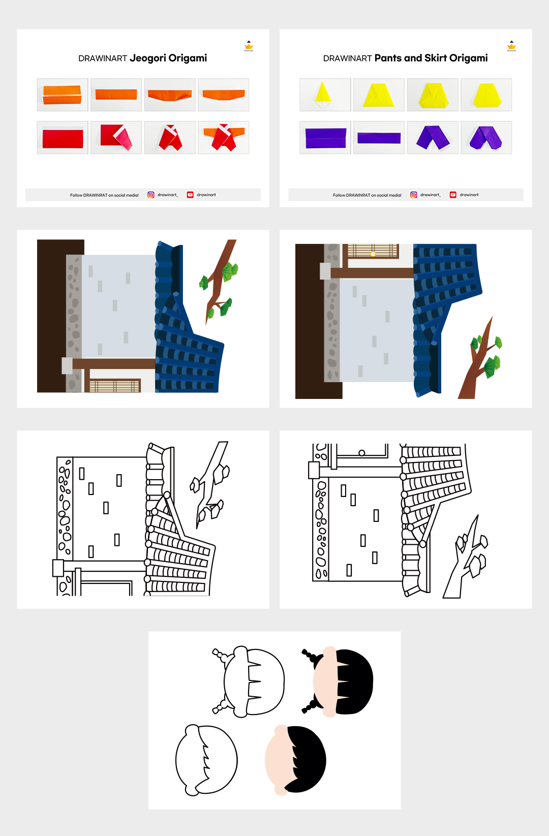 We’ve prepared a printable template to create a traditional Korean outfit, Hanbok, through origami! BTS and BLACKPINK have even worn Hanbok on stage, making headlines around the world. Recently, Netflix’s K-pop series Demon Hunters has also boosted global interest in Korean culture. With DRAWINART’s Hanbok origami template, you and your child can enjoy crafting and exploring the beauty of Korea’s traditional attire!
